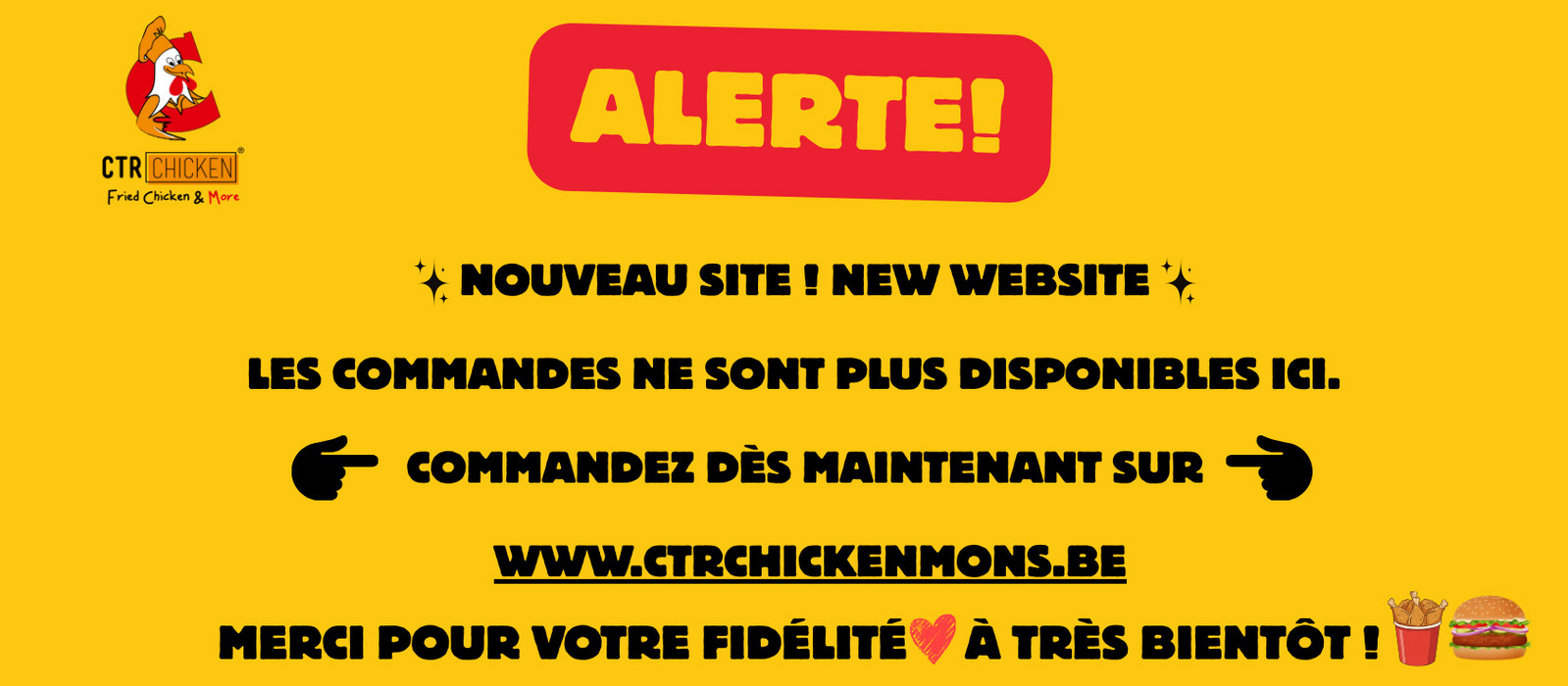 Nous vous invitons dès maintenant à passer vos commandes sur notre nouveau site 👉 www.ctrchickenmons.be